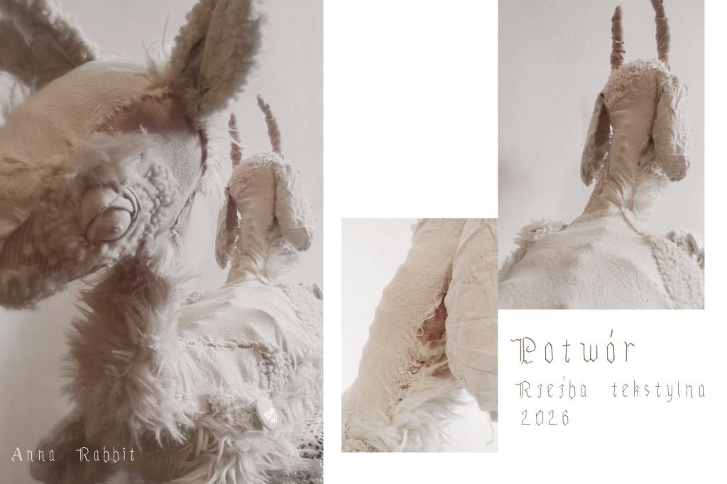 Potwór zaprasza do kontaktu. Warto go dotknąć, wyczuć pod palcami kręgosłup i żebra, zagłębić dłoń w miękkiej sierści, spróbować spojrzeć mu w dwie pary oczu. Rzeźba została wykonana z materiałów z odzysku: skóra i futro powstały ze starej, dziecięcej piżamy oraz ze swetra. Jej wnętrzności tworzą plastikowe opakowania po żwirku do kuwet królików, żebra – znaleziony na śmietniku drut, a kręgi kręgosłupa to sztuczne perły. Ciało Potwora składa się z fragmentów codzienności i historii milcząco zamkniętych w przedmiotach.