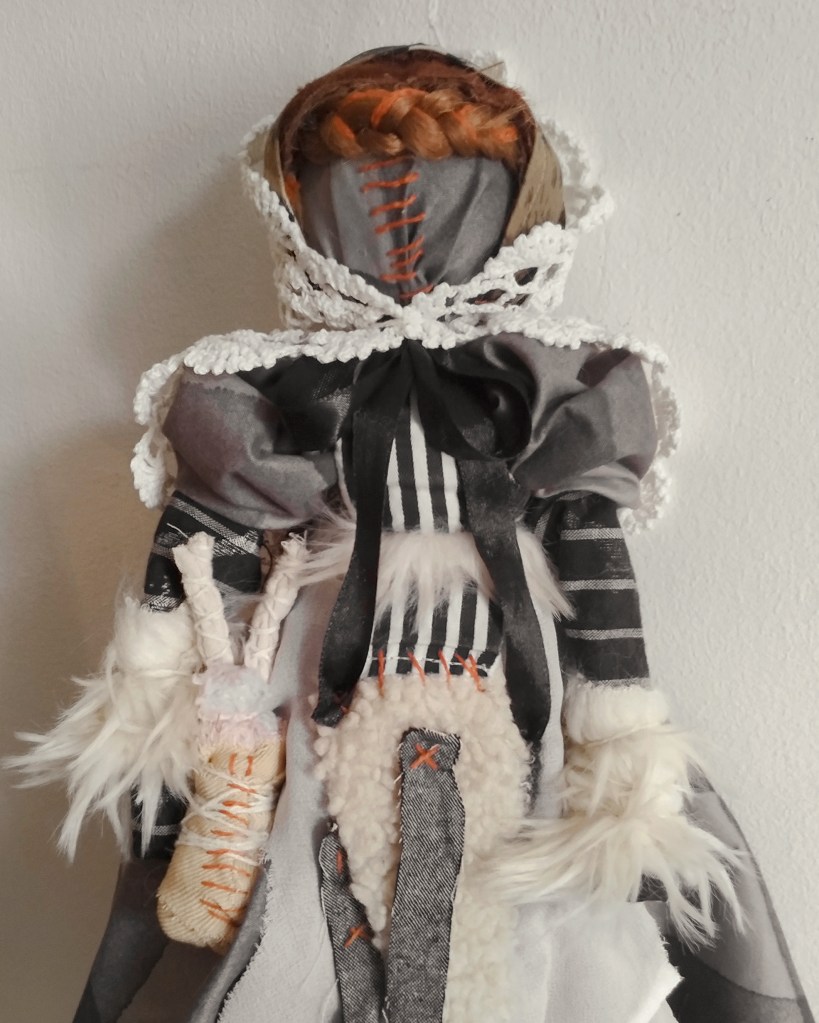Motanka dolls are often made with a child, but this one features a rabbit instead.